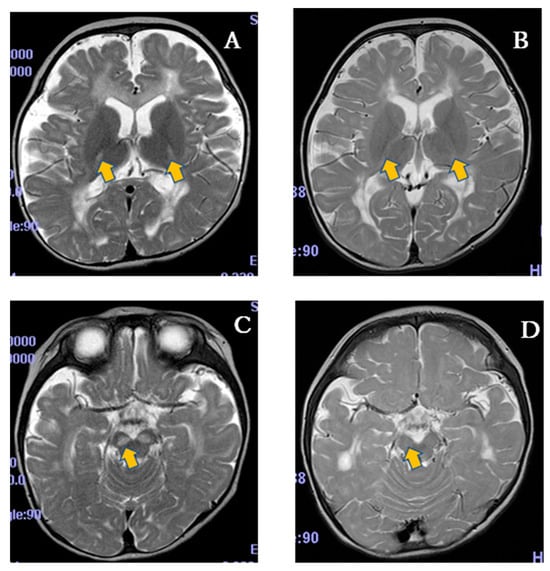 Magnetic resonance imaging of the brain. PLA-04-01 at 19 months old before entering the trial (A,C) and at 36 months old after treatment with 5-ALA and SFC for 17 months (B,D). T2-weighted MRI showed high signal intensity in the bilateral basal ganglia (lateral thalamus) and brainstem (substantia nigra) before the trial (A,C), which decreased after the trial (B,D). The arrows indicate those legions before and after the trial.