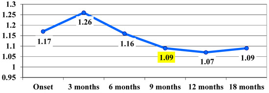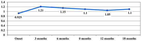 The t Student calculation for highlighting the significance of differences between the average values in VA at the transition from one stage of the assessment to another showed that, between the 6-month and 9-month assessments, the difference was significant, with the average value decreasing significantly from 1.16 logMAR ± 0.59 at 6 months to 1.09 logMAR ± 0.56 at 9 months, with t(17) = 2.2 and p = 0.04 (Table 2, Figure 1).