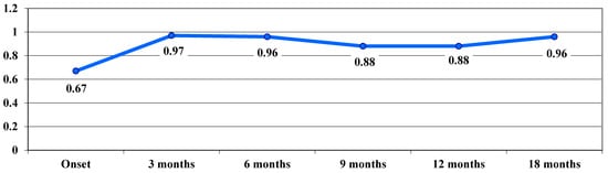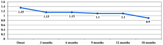 VA in the dynamic phase showed a trend of continuous improvement during follow-up, from a VA average value of 1.35 logMAR at baseline to 0.9 logMAR after 18 months, with no significant differences between stages (Figure 3).