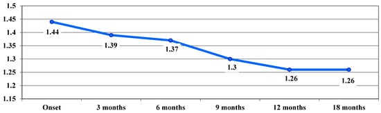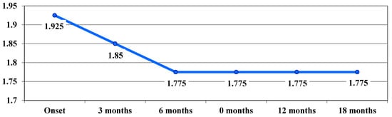 At the beginning of the study, there were 11 off-chart cases (61.11%); after 3 months, the frequency decreased to 10 cases (a decrease of 5.55%), which remained stable at 6 and 9 months, and then decreased to 8 cases in month 12 (a further decrease of 11.11%) and remained stable in month 18 (Table 4).