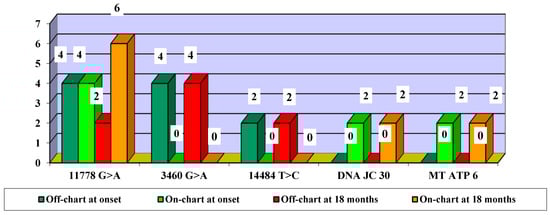 In terms of mutation evolution, the largest increase in the frequency of on-chart cases from baseline to month 18 occurred in association with the 11778 G > A mutation (an increase from two cases at baseline to six cases at month 18). The largest decrease in off-chart cases occurred in cases associated with the 3460 G > A mutation (from 4 cases at baseline to 0 cases at month 18), followed by the association with the 14484 T > C mutation (from 2 cases at baseline to 0 cases at month 18) (Figure 8).