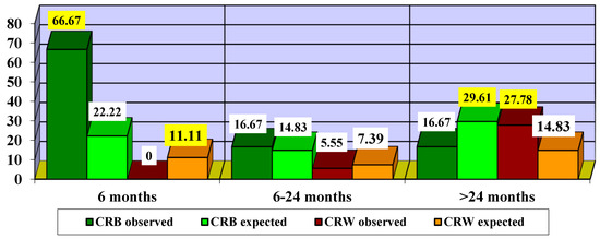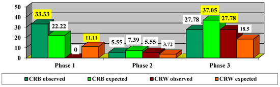 Since the χ2 value with Yates correction = 4.5 is significant at p = 0.034, it proves that there are significant differences in the impact of treatment depending on the phase. Thus, it was found that, in the acute phase, there were more CRB cases observed (33.33% compared to 22.22% expected) and fewer CRW cases observed (0% compared to 11.11% expected). In the dynamic phase, there were slightly fewer CRB cases observed (5.55% compared to 7.39% expected) and slightly more CRW cases observed (5.55% compared to 3.72% expected). In the chronic phase, fewer CRB cases were observed (27.78% compared to 37.05% expected), and more CRW cases were observed (27.78% compared to 18.5% expected).
