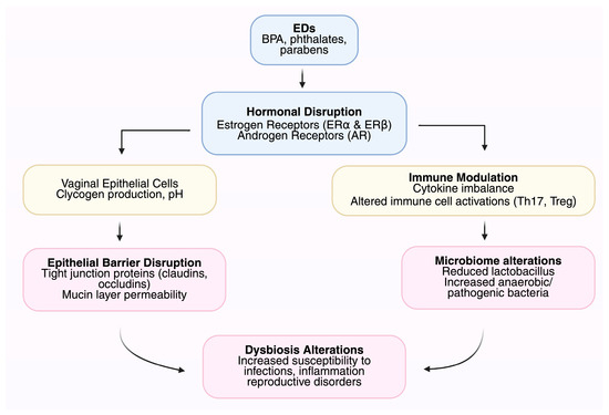 EDs can have immunomodulatory and inflammatory actions that can potentially further upset tissue homeostasis [30]. Through the modulation of cytokine production, immune cell signaling, and mucosal barrier function, EDs could set the stage for susceptibility to infections, chronic inflammation, and loss of tissue regulation—factors that are increasingly recognized as affecting the composition and stability of the genital tract microbiome [31].