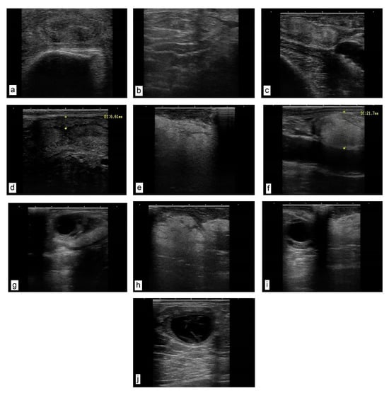 Ultrasound images of the genital tract. Transrectal linear probe, 7.5 MHz. (a) Heifer cervix, cross-section near the involute flower. The folds of the cervical mucosa have a relatively uniform, denser, hyperechoic texture. (b) Cow cervix with proliferation of endocervical folds and their densification. (c,d) Uterine wall of a cow in puerperium. Normal uterus as an echogenic structure with the presence of a characteristic lumen. (e–i) Cow in puerperium. (e) Hypoechoic (fatty) formation, located paracervically. (f) Hypoechoic formation located parasalpingially, adherent to the serosa (longitudinal section) (size 21.7 mm). (g) Reactive cow ovary (with dominant follicle). The periovarian area presents a uniform marbled halo with a fatty appearance. (h) Sixty days postpartum. Uterine formation, amorphous, homogeneous texture with several areas of densification. (i) Reactive ovary with dominant follicle and parasalpingian formation on ligament (meso-ovary), uniform pixelated fatty appearance. (j) Heifer ovary 14 days after oestrus. Luteinic ovarian cyst, and a hypoechoic area with septa inside.