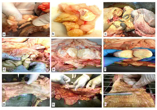 Macroscopic morphological aspects of abdominal organs. (a,b) Necrosis of abdominal fat. Lipogranulomas. (c) Necrosis of mesenteric fat. (d,e) Lipogranulomas in the broad ligaments of the uterus. (f) Paracervical lipogranuloma. (g) Lipogranulomas in the uterine horns. (h) Parauterine lymph nodes and lipogranulomas in the uterine horns. (i) Cervical fibrosis.