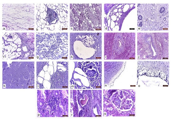 Histopathological aspects of different abdominal tissues and organs. Masson’s trichrome stain. (a) Abdominal adipose tissue. Adipocyte necrosis. (b) Necrosis and inflammation. Inflammatory reaction with macrophages and giant cells. (c) Infiltration of the myometrium with lipids and dissociation of smooth muscle fibres through lipid deposition and associated inflammatory reaction. (d) Lipids in the uterine wall. (e) Lipids in the chorion of the uterine mucosa. (f) Lipids and inflammatory reaction in the uterine ligaments. (g) Parauterine lymph node. Infiltration with lipids. Dissociation of lymphoid follicles through lipid deposition. Inflammatory reaction. (h) Uterine artery. Lipid deposition in the wall of the uterine artery and secondary inflammatory infiltrate. (i,j) Amyloidosis of the ovarian artery branches. (k) Exocrine pancreas necrosis. (l,m) Severe lipid infiltration of the pancreas. Lipids are partially saponified. (n,o) Aorta. Intimal and subintimal lipid infiltration, disrupting the vascular endothelium. (p) Kidney. Lymphoplasmacytic interstitial nephritis. (r) Hyaline casts in the urinary tubules. (s) Amyloidosis of the glomerular capillaries.