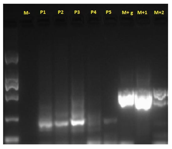 PCR test results for Mycobacterium spp. M-: negative control; P1–P5: samples tested; M+g: chicken liver extract control; M+1, M+2: positive controls from Mycobacterium spp. culture.