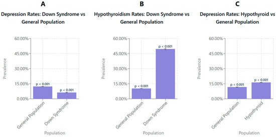 Survey-weighted comparisons of depression and hypothyroidism prevalence between the general population and individuals with DS and between individuals with and without hypothyroidism. (A) The prevalence of depression was significantly lower among individuals with DS (6.27%, 95% CI: 5.9–6.6) compared to the general population (12.27%, 95% CI: 12.2–12.4). (B) The prevalence of hypothyroidism was significantly higher in individuals with DS (49.57%, 95% CI: 48.9–50.2) than in the general population (10.28%, 95% CI: 10.2–10.3). (C) Individuals with hypothyroidism exhibited a higher prevalence of depression (16.32%, 95% CI: 16.2–16.4) compared to the general population (11.72%, 95% CI: 11.6–11.8). All values were estimated using survey-weighted linear regression models adjusted for clustering, stratification, discharge weights, age at hospitalization, and year-fixed effects to account for temporal trends in the National Inpatient Sample (2016–2019). Error bars represent 95% confidence intervals.