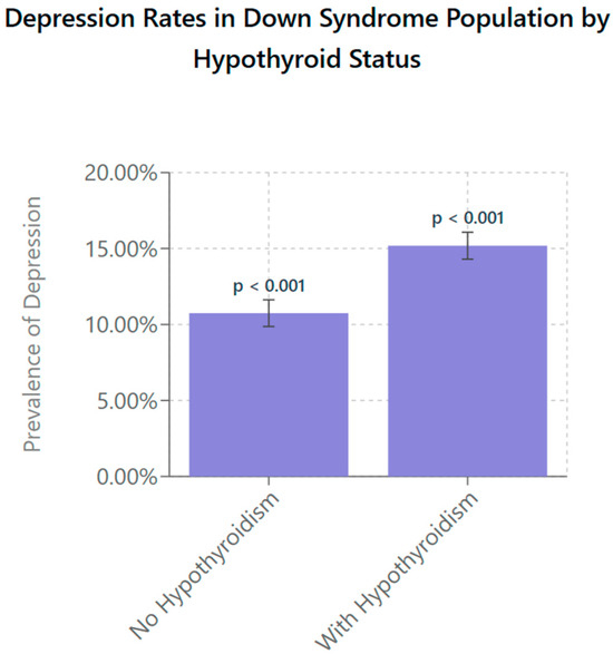 Depression prevalence in individuals with DS stratified by presence of hypothyroidism. Using survey-weighted logistic regression with age and year-fixed effects, individuals with DS and comorbid hypothyroidism were found to have a significantly higher prevalence of depression (15.18%, 95% CI: 14.3–16.1) compared to their euthyroid DS counterparts (10.75%, 95% CI: 9.9–11.6; p < 0.001). Models incorporated survey weights, clustering at the hospital level, and stratification to account for the NIS’s complex sampling design. Error bars represent 95% confidence intervals, indicating the precision of the population-level estimates.