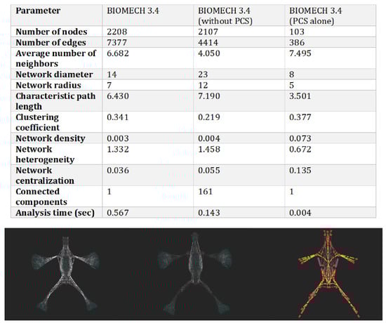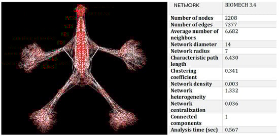 The network derived from the BIOMECH 3.4 model (Figure 2, Table 2) revealed a highly complex and integrated structure, consisting of