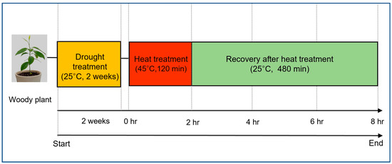 In this study, a modified version of the method described by Rizhsky et al. [7] was applied to evaluate sequential drought and heat stress tolerance in woody plants. Rizhsky et al. [7] induced heat stress by increasing the temperature in a growth chamber and imposed drought stress by withholding water until the plants reached a relative water content of 70% to 75%. The sequential drought and heat stress were applied sequentially, first by subjecting plants to drought stress, followed by heat stress treatment. In this context, the term “sequential” refers to the intentional order of stress application, in which drought stress is followed by heat stress, and it does not imply multiple phases of drought. This sequential treatment was intended to reflect actual climate conditions, and the drought stress applied was of sufficient intensity to induce physiological stress rather than serving as a mild pre-treatment to enhance tolerance. In this study, while following the original process described by Rhizsky et al. [7], the drought and heat stress conditions were modified to account for the climate conditions in Korea and the characteristics of the plant species used.