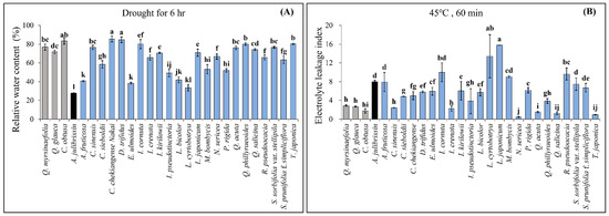 Pre-screening of drought–heat dual stress-tolerant woody plants. (A) Identification of drought-tolerant species based on RWC measurements. (B) Identification of heat-tolerant species based on ELI measurements. The species with a gray bar represent tolerant species, those with a black bar represent vulnerable species, and those with blue bar are screened species. The data are presented as mean values with standard deviation (SD) from three independent replicates (n = 3). Different letters (a–l) indicate statistically significant differences according to Duncan’s multiple range test at the p < 0.05 level.