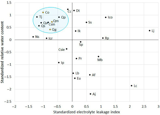 Scatter plot of standardized relative water content and electrolyte leakage index across tree species. The abbreviated labels inside the plot represent scientific names, as listed in Table 1. The orange-dotted species are previously validated heat–drought dual stress-tolerant species. Species surrounded by a blue circle were selected as heat–drought dual stress-tolerant species.