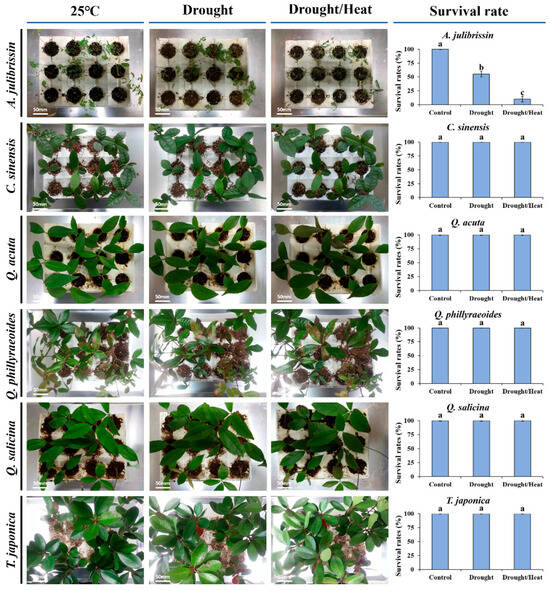 Figure 4 presents the phenotypic characteristics of previously selected sequential drought and heat stress-tolerant woody plant species under experimental stress conditions. These species, including C. sinensis, Q. acuta, Q. phillyraeoides, Q. salicina, and T. japonica, were subjected to two weeks of drought stress followed by high-temperature exposure at 45 °C.