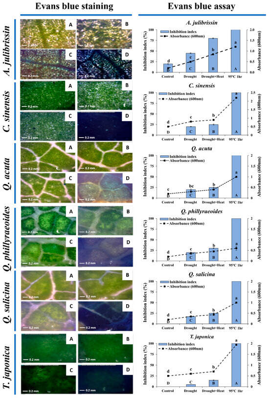 In conclusion, Evans blue staining confirmed that sequential drought and heat stress-tolerant candidate species (C. sinensis, Q. acuta, Q. phillyraeoides, Q. salicina, and T. japonica) possess clear cellular-level tolerance.
