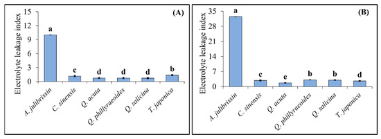 Figure 6 presents the results of measuring the ELI to evaluate the tolerance of sequential drought and heat stress-tolerant woody plants. One-year-old seedlings of the selected tolerant candidate species (C. sinensis, Q. acuta, Q. phillyraeoides, Q. salicina, and T. japonica) and the sensitive control species (A. julibrissin) were subjected to drought stress for two weeks, followed by exposure to high-temperature conditions at 45 °C. After the treatments, the ELI was measured in leaf tissues to assess the extent of cell membrane damage.