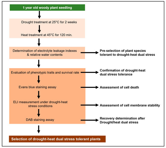 Screening strategy for drought–heat dual stress tolerance in woody plants.