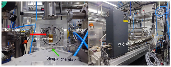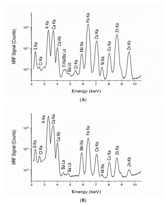 XRF measurement was performed on the BL7.2W beamline of the Synchrotron Light Research Institute (SLRI), Thailand. A monochromatic focused X-ray beam with a size of 4 × 2 mm2 (hor. × ver.) was exposed to a sample placed at 45 degrees to the incident X-ray beam. A four-element silicon drift detector (SDD), Vortex@-ME4 (Hitachi High-Tech Science America, Inc., Chatsworth, CA, USA), with a 10 mm sleeve diameter, was positioned perpendicular to the sample to capture the emitted fluorescent X-rays. Measurement of X-ray fluorescence was performed with an X-ray energy of 12.90 keV and an exposure time of 20 min for sample measurement in a helium atmosphere. Helium gas was purged in the acrylic sample chamber to ensure high efficiency in detecting low-mass elements such as S, Cl, K, and Ca. The energy of the incident beam tuned by a Si (111) double-crystal monochromator was chosen depending on the elements of interest, and all the measurements were conducted in triplicate. The sample-to-detector distance was 7.5 cm. The photon flux of 12.9 keV monochromatic X-rays with a double Si (111) crystal measured by an ion chamber was 1.05 × 1011 photons/s at 100 mA stored electron beam. Beamline specifications and performance were previously reported [33]. Figure 1 shows a picture of the experimental setup and the apparatus. The sample was placed in the sample chamber and exposed to a monochromatic-focused X-ray beam. The XRF spectrum was analyzed via PyMCA (version 5.5.5) [34], which was created by the Software Group at the European Synchrotron Radiation Facility (ESRF) (http://pymca.sourceforge.net/PyMca).