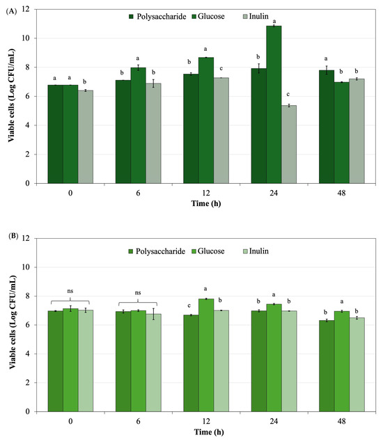 The impact of freeze-dried polysaccharide powder derived from L. platensis on the growth of probiotics was refined using a more precise methodology [38], with Lactobacillus rhamnosus ATCC 53103 obtained from the American Type Culture Collection (ATCC, Manassas, VA, USA) and Bifidobacterium longum subsp. longum TISTR 2195 obtained from the Thailand Institute of Scientific and Technological Research (TISTR, Pathum Thani, Thailand) utilized as reference strains. L. rhamnosus ATCC 53103 and B. longum TISTR 2195 were cultured in MRS and MRS supplemented with 0.05% L-cysteine, respectively. L. rhamnosus was incubated at 37 °C for 18 h. B. longum was incubated under anaerobic conditions using an AnaeroPack (AnaeroPack-Anaero, Mitsubishi Gas Chemical Company, Inc., Tokyo, Japan) at the same temperature for 18 h. Following this, 10% (v/v) of the culture was transferred into fresh medium broth and incubated at the same temperature for an additional 12 h. The cells were then centrifuged at 3660× g for 10 min, subjected to two wash cycles with 0.1% peptone, and resuspended in a 0.1% peptone solution. The probiotic bacterial preparation, prepared by diluting the cell suspension, achieved an absorbance of 0.2 at an optical density of 600 nm. Freeze-dried powder derived from L. platensis at 2% (w/v) was supplemented in the minimum medium broth. The control utilized glucose and inulin as reference standards. The suspension preparations of L. rhamnosus ATCC 53103 and B. longum TISTR 2195, at 10% (v/v), were added to the test and were incubated at 37 °C for 48 h. The viable cells of L. rhamnosus ATCC 53103 and B. longum TISTR 2195 were quantified using the plate count method on MRS agar and MRS agar supplemented with 0.05% L-cysteine, respectively, during cultivation for 48 h.
