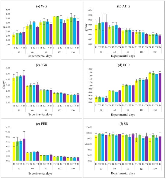 Throughout the 150-day experimental period of feeding with PPE at four different concentration levels (including the control group), it was found that all parameters, i.e., WG, ADG, SGR, FCR, PER, and SR, showed no statistical difference (p > 0.05) (Figure 1a–f).