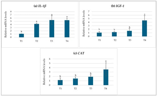 A total of six fish were randomly sampled from each treatment group (T1–T4) for gene expression analysis. Simple random sampling was conducted by using a handheld fish net to scoop two fish at a time from the tank. Following anesthesia using MS222 (Sigma, St. Louis, MO, USA) solution at a concentration of 0.2 g/L, liver tissues were collected and preserved in TRIzol reagent (Molecular Research Center, Cincinnati, OH, USA) at −20 °C until RNA extraction. One microgram of the extracted total RNA was used for first-strand cDNA synthesis using the iScript™ Select cDNA Synthesis Kit (Bio-Rad, Hercules, CA, USA), following the manufacturer’s protocol. RT-qPCR reactions were conducted in a final volume of 20 μL, comprising 10 μL of 2× master mix (THUNDERBIRD™ SYBR® qPCR Mix, TOYOBO, Osaka, Japan), 0.3 μL of 10 μM of each primer, and 2 μL of first-strand cDNA (10 ng/μL). The amplification protocol included an initial denaturation at 95 °C for 1 min, followed by 40 cycles of denaturation at 95 °C for 15 s; annealing at 60 °C for 15 s for the IL-1β, IGF-1, and β-actin genes, and 57 °C for 15 s for the CAT gene; and extension at 72 °C for 10 s. A melting curve analysis was subsequently performed from 55 °C to 95 °C, with a ramp rate of 0.3 °C/s. Each sample was subjected to triplicate reactions for analysis.