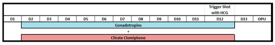 - Singh, A.; Bhandari, S.; Agrawal, P.; Gupta, N.; Munaganuru, N. Use of clomiphene-based stimulation protocol in oocyte donors: A comparative study. J. Hum. Reprod. Sci. 2016, 9, 159–163. [Google Scholar] [CrossRef] [PubMed] [PubMed Central]