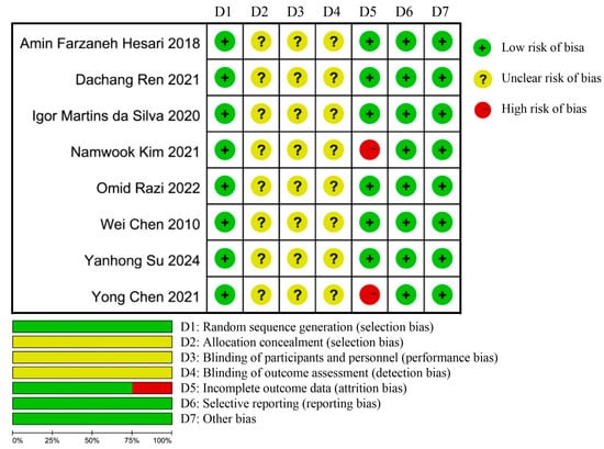 The Cochrane Collaboration’s RCT bias assessment tool was used to evaluate the following: (1) random sequence generation; (2) allocation concealment; (3) the blinding of participants and personnel; (4) the blinding of outcome assessment; (5) incomplete outcome data; (6) selective reporting; (7) other potential bias sources. The assessment of the risk of bias was carried out independently by two authors (H.C. and P.L.), and any discrepancies were resolved through discussion.