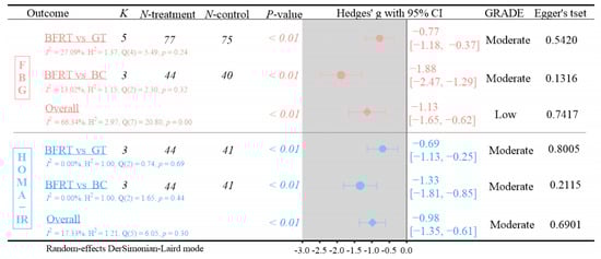 - Three RCTs were included in the HOMA-IR analysis. Compared with conventional training, BFRT significantly improved HOMA-IR (Hedges’ g = −0.69, 95% CI: −1.13 to −0.25; p < 0.01, I2 = 0%; GRADE: moderate; Egger’s test: p = 0.8005). Compared with BC, BFRT showed greater improvements in HOMA−IR (Hedges’ g = −1.33, 95% CI: −1.81 to −0.85; p < 0.01, I2 = 0.00%; GRADE: moderate; Egger’s test: p = 0.2115).