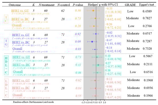 - Five RCTs were included in the TC analysis. BFRT demonstrated no significant effects on TC levels compared to GT or BC (Hedges’ g = −0.26, 95% CI: −0.72 to 0.21; p = 0.28, I2 = 56.43%; GRADE: low; Egger’s test: p = 0.2766).
