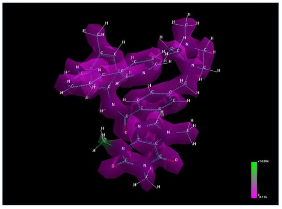 Molecular lipophilicity can also be assessed through electrostatic potential, a valuable property for analyzing and predicting reactive molecular behavior. This potential highlights the polarity of specific regions on the molecule’s van der Waals surface, visualized as a three-dimensional electron density map with electrostatic potential values represented by color (Figure 1). Areas with high potential values (positive zones, shown in green) strongly attract water molecules, while areas with lower values (negative zones, shown in purple) do not exhibit an attractive character, making them hydrophobic regions.