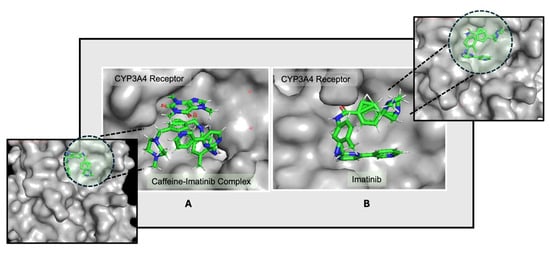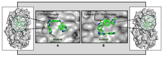 Docking conformations of the receptor CYP3A4 with imatinib (A) and of the caffeine–CYP3A4 complex with imatinib (B), highlighting differences in orientation. The ligand molecules are represented as sticks colored according to the atoms present (C—green, N—blue, O—red, H—white), and the receptor is highlighted in light gray. The altered conformation in (B) suggests that caffeine may modulate imatinib’s interaction with CYP3A4 [48].