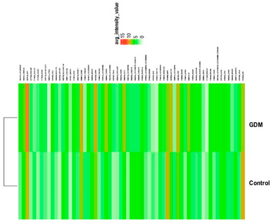 Heatmap and hierarchical cluster analysis of differentially expressed genes. The heatmap shows the relative induction or repression of genes in gestational diabetes mellitus (GDM) and controls. Green indicates higher expression; red indicates reduced mRNA expression; light green indicates no changes.