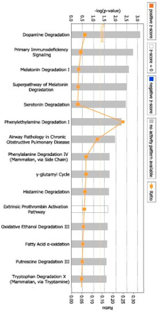 The highest-scoring networks indicated associations with diseases and disorders that mainly comprised (number of molecules) Cancer (13), Cardiovascular Disease (5), Connective Tissue Disorders (2), Dermatological Disease and Conditions (6), and Developmental Disorders (2). Genes within the Molecular and Cellular Functions network included Drug Metabolism (3), Carbohydrate Metabolism (1), Cell-to-Cell Signaling and Interaction (6), Cellular Assembly and Organization (5), and Energy Production (1). In the Physiological System Development and Functions network, the significant functions were Embryonic Development (4), Organ Development (4), Organ Morphology (1), Organismal Development (5), and Organismal Functions (1). Our IPA analysis indicates that multiple significant CPs are impacted by pGDM, i.e., Dopamine Degradation (Figure 2).