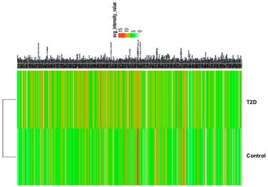 In patients with T2D, 583 gene transcripts were significantly altered in comparison with controls (p < 0.05). Of these, 490 showed an increase, and 93 displayed a decrease in transcript levels, as depicted by the heatmap (Figure 3, Table 6).