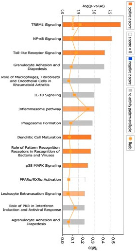 Furthermore, a review of the previously mentioned genes (583 gene transcripts) revealed five significant genetic networks (p < 0.05, score ≥ 23) in T2D through the use of IPA, as outlined in Table 8. The networks with the highest scores suggested associations with diseases and disorders that primarily included (number of molecules) Connective Tissue Disorders (66), Immunological Disease (120), Inflammatory Disease (90), Inflammatory Response (95), and Organismal Injury and Abnormalities (282). Genes located within the Molecular and Cellular Functions network included Cell Death and Survival (103), Cell-To-Cell Signaling and Interaction (72), Free Radical Scavenging (20), Cellular Movement (68), and Post-Translational Modification (30). In the Physiological System Development and Functions network, the important functions were Hematological System Development and Function (51), Immune Cell Trafficking (38), Digestive System Development and Function (14), Hepatic System Development and Function (14), and Organ Development (19). Our IPA analysis reveals that several important CPs are affected by T2D, specifically TREM1 Signaling (Figure 4).