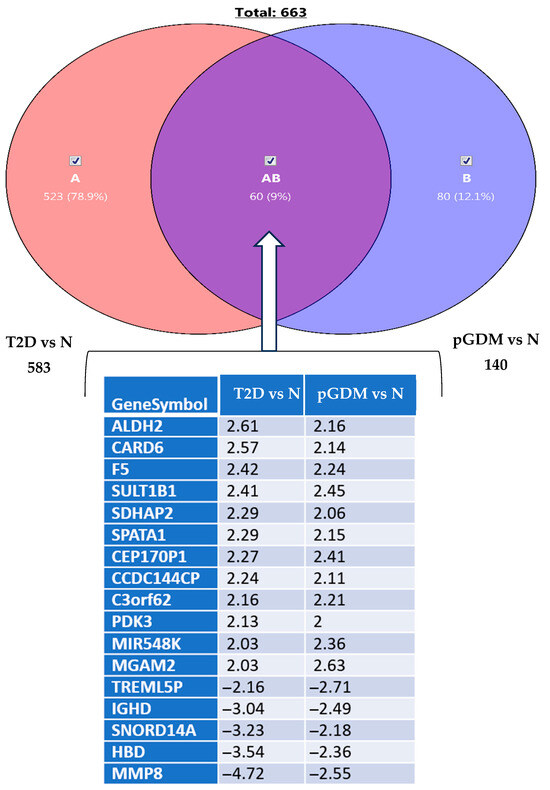 Venn diagrams showing the total number of shared genes between pGDM or T2D (A and B, respectively) and controls (N). Sixty differentially expressed transcripts were shared by pGDM and T2D (AB), of which seventeen are displayed along with their gene symbols and fold changes (p < 0.05, fold change cut-off ≥ 2).