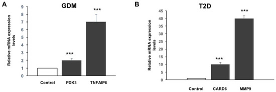 Women with pGDM are at a higher risk of developing T2D later in life [20], and the fundamental pathophysiological mechanisms that contribute to this remain incompletely understood. The role of inflammation in the onset of GDM has become a central focus in recent research [21]. Modified glycosylation patterns could act as potential biomarkers of the pathophysiology related to diabetes and could be used for therapeutic targeting [22]. Apoptosis plays an important role in the pathogenesis of diabetes, as hyperglycemia induces reactive oxygen species (ROS). This leads to considerable cellular damage and to a point of no return in apoptosis when insufficient cytoprotective and ROS scavenging molecules, such as catalase and superoxide dismutase, are available [23]. In this study, our microarray results revealed 140 differentially expressed transcripts in pGDM compared to the controls. A total of 583 differentially expressed transcripts were identified in patients with T2D compared to the controls. There were 60 shared genes between T2D versus controls and GDM versus controls, and this could imply possible disease progression to T2D. Of these differentially expressed genes, PDK3 and TNFAIP6 in pGDM and MMP9 and CARD6 in T2D were selected, as they are involved in inflammatory response, glycosylation, and death-like domains based on DAVID and IPA function analyses, which may be involved in the pathological progression to T2D. RT-PCR validation showed that these genes were upregulated, which confirmed the microarray results.