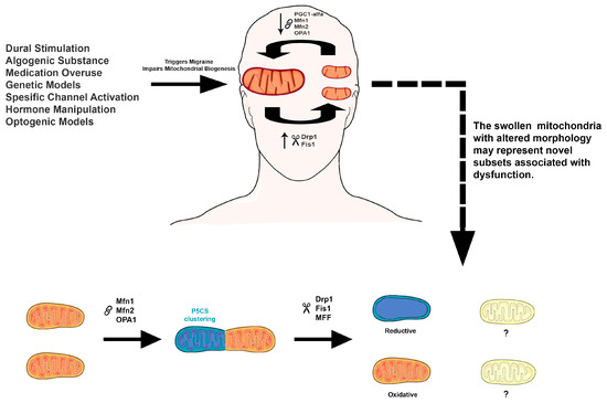 This connection between metabolic triggers and migraine pathophysiology has led to increasing interest in mitochondrial function. Recent evidence also indicates the existence of mitochondrial subpopulations with distinct metabolic properties—such as pyrroline-5-carboxylate synthase (P5CS)-rich mitochondria—which exhibit altered cristae structure, reduced ATP synthesis, and changes in fission–fusion dynamics [6]. These findings raise the possibility that mitochondrial heterogeneity, particularly involving P5CS-related subsets, may actively contribute to the pathogenesis of migraine. This hypothesis is addressed by outlining key experimental migraine models and evaluating mitochondrial dysfunction—including alterations in morphology, biogenesis, and dynamics—in the context of emerging mitochondrial subtypes.