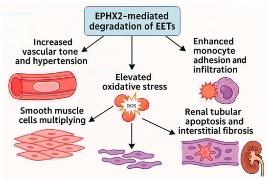 The EPHX2 enzyme, responsible for metabolizing epoxyeicosatrienoic acids (EETs), plays a pivotal role in endothelial dysfunction by attenuating vasodilatory and anti-inflammatory signaling pathways. Elevated EPHX2 activity has been implicated in CKD-related hypertension, albuminuria, and vascular inflammation [,]. Thus, EPHX2 represents another mechanistic bridge between inflammation and vascular injury in CKD. The implications of atherosclerosis are shown in Figure 2.
