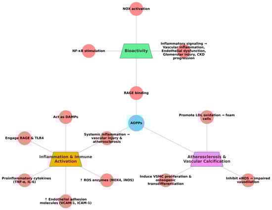 AOPPs represent oxidatively modified plasma proteins—primarily albumin—formed by neutrophil-derived oxidants. They are not passive byproducts but bioactive DAMPs that activate NOX, RAGE, and proinflammatory cytokines. Elevated AOPP levels are associated with glomerulosclerosis, malnutrition–inflammation syndrome, and vascular stiffness in both dialysis and non-dialysis CKD patients [,,,].