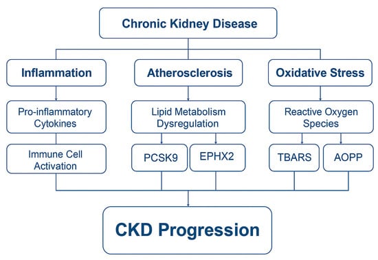 One of the most notable features of CKD is its strong link to cardiovascular disease (CVD), which causes over 50% of deaths in affected individuals. The risk of cardiovascular issues in CKD is unusually high—even in those with only mild decreases in glomerular filtration rate—pointing to shared underlying processes beyond traditional risk factors []. Increasingly, attention has turned to the roles of inflammation, oxidative stress, and lipid-related endothelial dysfunction in mediating both kidney and cardiovascular injury [].