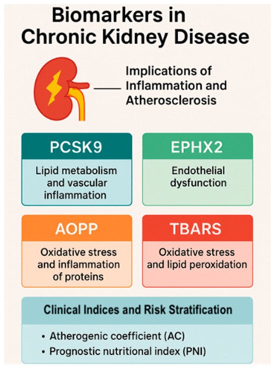 The pathogenesis of CKD is multifactorial but increasingly understood to involve a synergistic network of dysregulated lipid metabolism, oxidative stress, and chronic inflammation. In this context, the biomarkers PCSK9, EPHX2, AOPPs, and TBARSs might reflect distinct yet overlapping pathways that drive renal injury, atherogenesis, and cardiovascular complications [,,].