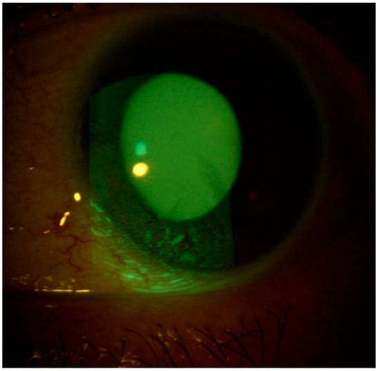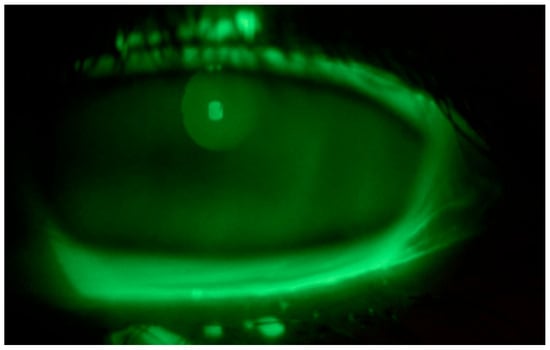 A 59-year-old Caucasian male patient with a past medical history of mild dyslipidemia received three doses of the Cominarty (Pfizer-BioNTech) vaccine for SARS-CoV-2 (with the last dose administered 7 months before coming into our observation). The patient was evaluated for the presence of about six weeks’ ocular burning in both eyes, which was associated with foreign body sensation, and symptoms of asthenopia—characterized by visual fatigue, ocular discomfort, blurred vision, and frontal headaches triggered or worsened by prolonged near tasks, particularly during video terminal work (VDT). These symptoms began a few days after the patient contracted COVID-19. He had a fever in his first three days of the COVID-19 illness, which was associated with persistent upper respiratory congestion; molecular buffer negativization was detected 9 days after the first positive RT-PCR test. He also reported that he had never noticed any previous ocular surface disturbances or foreign body sensations. Ophthalmological examination showed a best-corrected visual acuity of 0.0 LogMar in both eyes; reduced lacrimal meniscus in both eyes; punctate epitheliopathy in the lower corneal sectors of right (CLEK: 2) (Figure 1) and left eye (CLEK: 3) (Figure 2), according to the Collaborative Longitudinal Evaluation of Keratoconus (CLEK) grading system; slight cortical clouding of the lens in both eyes; normal ocular ductions; mild exophoria and convergence deficit, with a proximal point of convergence (PPC) of 38 cm; and no pathological findings in the fundus oculi in both eyes.