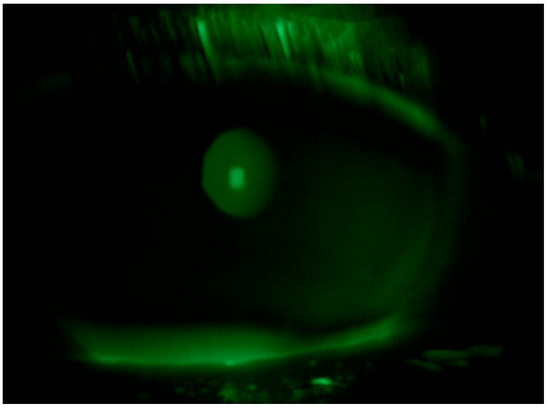Tear substitute composed of hyaluronic acid, vitamin B2, vitamin E-TPGS, methylsulfonylmethane, and amino acids four times a day in both eyes and an antibiotic ointment (tetracycline + sulfamethylthiazole) before bedtime were prescribed; an ophthalmological follow up was performed after ten days: negative corneal Fluotest in both eyes (Figure 3 and Figure 4); TBUT right eye: 6 s, TBUT left eye: 5 s; Schirmer I test right eye: 10 mm, Schirmer I test left eye: 9 mm; and OSDI: 25.