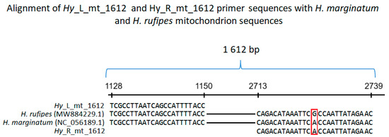 Alignment of Hy_L_mt_1612 and Hy_R_mt_1612 primer sequences with fragments of H. marginatum (NC_056189.1) and H. rufipes (MW884229.1) mitochondrial sequences. The reverse primer (Hy_R_mt_1612) sequence is shown as reverse complementary. The numbers on the horizontal line represent nucleotides in H. marginatum (NC_056189.1) and H. rufipes (MW884229.1) mitochondrial sequences. The red frame highlights a mismatch between the analyzed sequences.