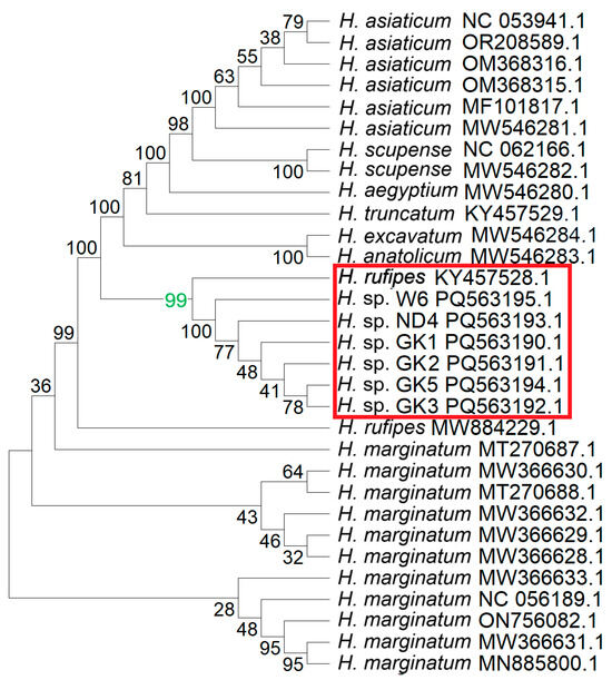 Results of phylogenetic analysis of fragments of the sequenced mtDNA and other Hyalomma species. The consensus of the sequenced mtDNA fragments was constructed, followed by BLAST analyses, which allowed for the retrieval of sequences from GenBank showing 100% coverage to the sequences from Hyalomma isolates GK_1, GK_2, GK_3, ND_4, GK_5, and W6. The sequences were analyzed using the Neighbor-Joining method, with 1000 bootstrap replicates. The resulting Bootstrap Consensus Tree is shown. Numbers at the nodes represent bootstrap support values, indicating the percentage of replicates in which a given clade was recovered. The value 99 (green) strongly indicates that GK1, GK2, GK3, ND4, GK5, W6, and H. rufipes all belong to the same clade (red frame).