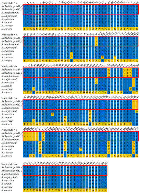 Alignment of rDNA fragments from Rickettsia detected in ticks collected in Nowa Dęba (ND) and Góra Kalwaria (GK) with corresponding fragments from other Rickettsia species. Rickettsia sp. ND_4, the sequence of a DNA fragment from Rickettsia sp. collected from a tick in Nowa Dęba (14 May 2024) (GenBank No. PV335514). Rickettsia sp. GK_5, the sequence of a DNA fragment from Rickettsia sp. collected from a tick in Góra Kalwaria (15 May 2024) (GenBank No PV335515). The sequenced fragments were searched against GenBank using the BLAST algorithm. Representative sequences from closely related species were retrieved, followed by construction of an alignment using MultiAlin and manual visualization. R. aeschlimannii (GenBank No. MW295947.1), R. rhipicephali (GenBank No. CP003342.1), R. massiliae (GenBank No. PP263042.1), R. raoultii (GenBank No. MG974041.1), R. conorii (GenBank No. CP098324.1). The red frame indicates 100% identity between the ND_4 and GK_5 sequences with R. aeschlimannii. The presented alignment depicts only the residues that differ across the sequences.
