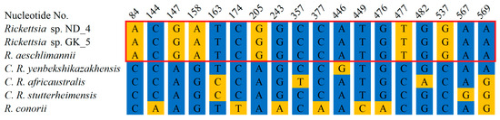 Alignment of genomic DNA encoding outer membrane protein A (OmpA) fragments from Rickettsia detected in ticks collected in Nowa Dęba (ND) and Góra Kalwaria (GK) with corresponding fragments from other Rickettsia species. Rickettsia sp. ND_4—the sequence of a DNA fragment from Rickettsia sp. detected in a tick from Nowa Dęba (14 May 2024) (GenBank No. PV335516). Rickettsia sp. GK_5—the sequence of a DNA fragment from Rickettsia sp. detected in a tick from Góra Kalwaria (15 May 2024) (GenBank No. PV335517). The sequenced fragments were searched against GenBank using the BLAST algorithm. Representative sequences from closely related species were retrieved, followed by construction of an alignment using MultiAlin and manual visualization. R. aeschlimannii (GenBank No. OR687042.1), C. R. yenbekshikazakhensis (GenBank No. MG974005.1), C. R. africaustralis (GenBank No. KT835203.1), C. R. stutterheimensis (GenBank No. KT835243.1), R. conorii (GenBank No. OR148302.1). The red frame indicates 100% identity between the ND_4 and GK_5 sequences with R. aeschlimannii. The presented alignment depicts only the residues that differ across the sequences.