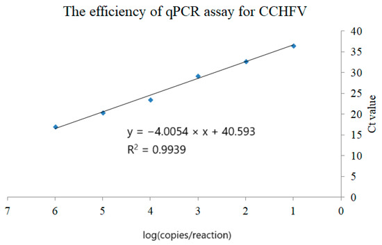Efficiency of qPCR amplification of CCHFV showing the dependency between the number of copies and the Ct value. The “x” axis represents logarithmic values from copy number per reaction, and the “y” axis represents corresponding medians from the three replicates. The calculated trend line R2 coefficient shows linear dependency. The assay could detect one copy of the standard (100) per reaction, but only in one of three replicates (not included in the figure).