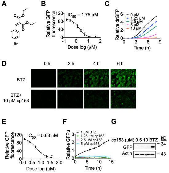 cp153 is a dislocation inhibitor. (A) Chemical structure of cp153, a small-molecule inhibitor identified through drGFP-based screening. (B) Dose–response curve showing cp153 inhibition of NHK dislocation (IC50 = 1.75 μM) in the drGFP assay. HeLa cells expressing NHK-drGFP were treated with cp153 and BTZ for 6 h. (C,D) Time-lapse imaging of drGFP fluorescence in HeLa cells expressing the ERAD substrate NHK. (C) Quantification of drGFP fluorescence intensity. (D) Representative fluorescence images from (C). Treatment with the proteasome inhibitor BTZ alone induced progressive GFP reconstitution due to NHK dislocation (top panel), while co-treatment with cp153 (10 µM) nearly abolished this signal (bottom panel), demonstrating potent inhibition of dislocation. (E) cp153 inhibition of CD3δ dislocation (IC50 = 5.63 μM) in the drGFP assay (conditions as in B). (F,G) GFPu reporter assay showing that cp153 does not accumulate GFPu like BTZ (F). Western blot confirmation of GFPu levels. β-actin: loading control (G).